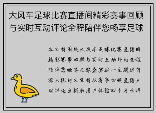 大风车足球比赛直播间精彩赛事回顾与实时互动评论全程陪伴您畅享足球盛宴
